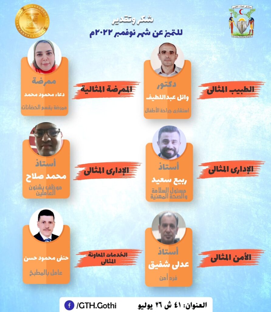 يتقدم الاستاذالدكتور شريف صفوت مدير عام المستشفى بخالص التهنئه والشكر للعاملين المثاليين لهذا الشهر عن جهدهم المبذول داخل المستشفى و إخلاصهم وتفانيهم في العمل ويسعدنا ان نعلن انه سوف يتم شهريًا اعلان المتميزين داخل المستشفى من جميع طوائف العاملين بها